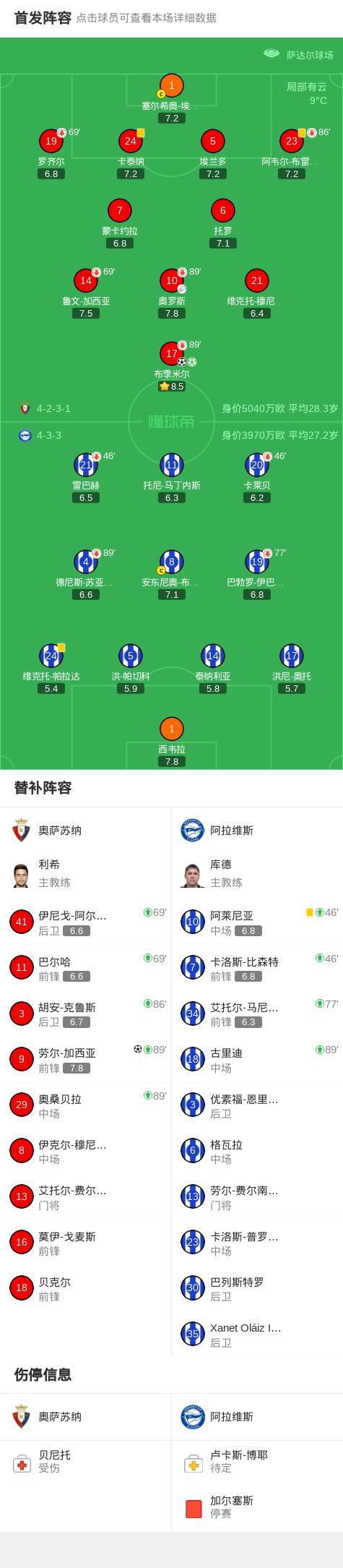北京时间12月21日西甲日报,西班牙足球甲级联赛第17轮,奥萨苏纳主场迎战阿拉维斯。比赛中,奥罗斯送出助攻,布季米尔推射破门,为球队首开纪录。随后,布季米尔再次登场罚入点球,扩大比分优势。下半场补时阶段,劳尔-加西亚攻入一球,锁定胜局。最终,奥萨苏纳以3-0战胜阿拉维斯。