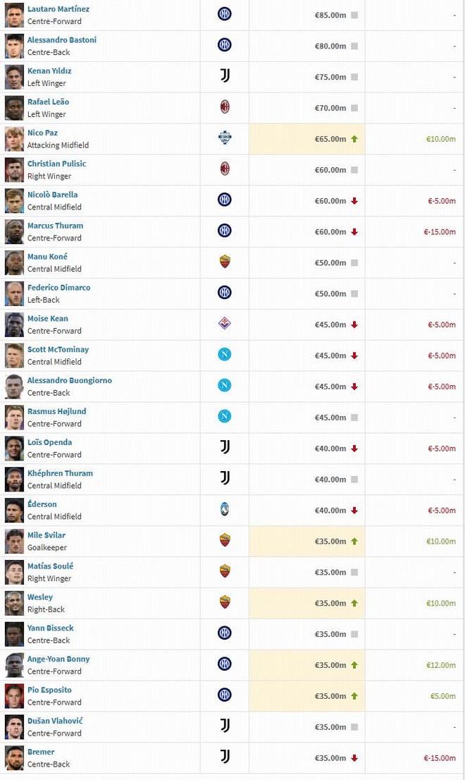 北京时间12月23日意甲日报,意甲身价更新:劳塔罗8500万欧居首,尼科-帕斯涨至6500万欧。