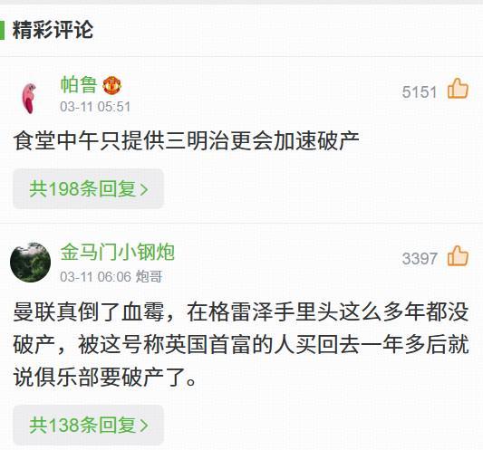 关于曼联可能会在圣诞节前破产的言论,多数球迷并不买账,认为“资本家哭穷是有一套的”、“早早把曼联卖给石油老板就完了”。