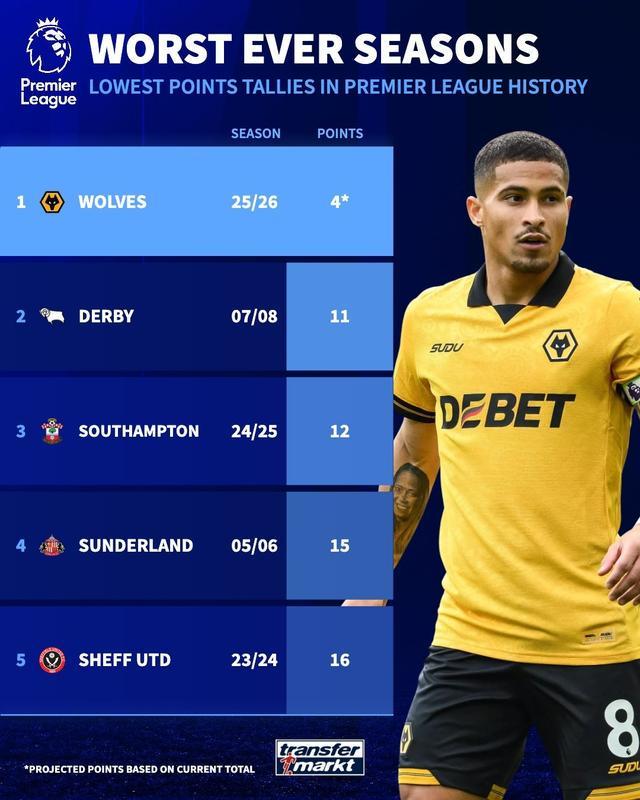 根据德转的估算,他们认为狼队本赛季最终赛季末得分仅有4分。而英超历史上单赛季最低分得主为德比郡在2007-08赛季创下的11分。